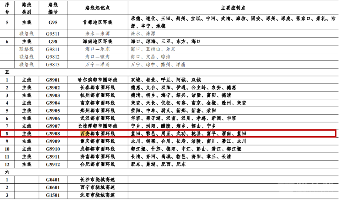 新的规划路网进一步加强了对城市群和都市圈发展支撑。从此次规划列表中可以看到,整体规划中增设了12条都市圈环线,其中就包括西安都市圈环线,编号为G9908,主要控制点衔接蓝田、鄠邑、周至、武功、乾县、富平等地。