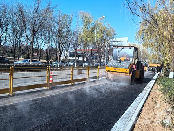 记者近日来到广运潭大道微改造施工现场,一派紧张有序的施工景象扑面而来。欧亚大道与广运潭大道十字处,2个新建导流岛轮廓清晰,工人们身着工装,操作摊铺机均匀摊铺沥青,滚烫的混合料在路面铺开后,压路机紧接着来回碾压,将路面压得平整坚实;秦汉大道与广运潭大道十字的4个导流岛已进入收尾阶段,这里地处高陵、临潼、西咸交界处,日常车流量密集,改造后新增的调头右转车道将有效破解此处通行瓶颈。全线14公里路段上,300余名作业人员分布在各个作业面,同步推进人行道翻建、路基处理、管线敷设等工序,道路、排水、交通、绿化、照明等多专业交叉施工,机械轰鸣声与工人作业声交织,提速攻坚的势头十足。